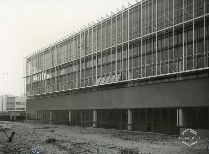 Lavori di costruzione dell'edificio B15, progettato dall'arch. Giordano Forti, adibito al confezionamento delle specialità medicinali; vedute interne ed esterne del fabbricato.